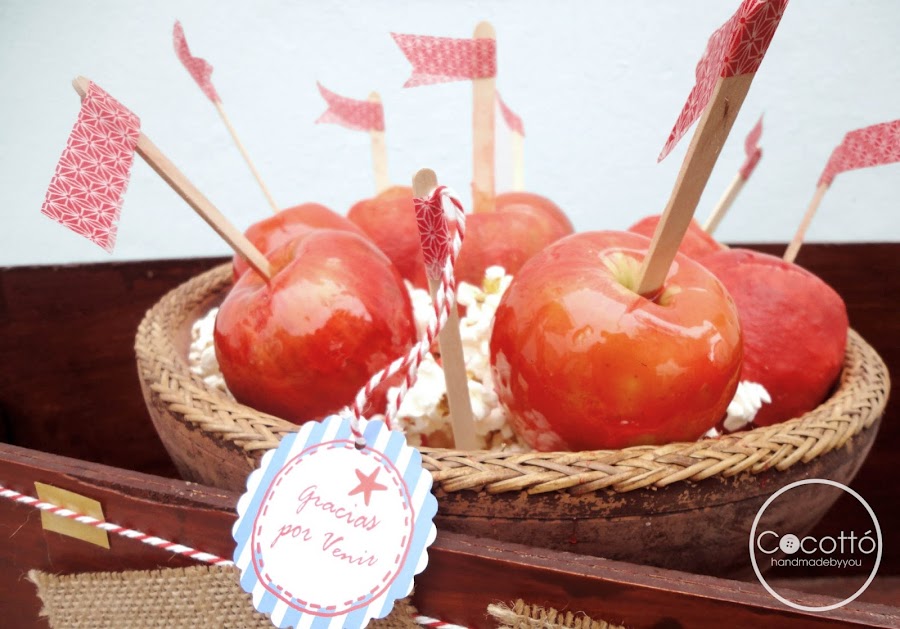 Una original idea fué crear manzanas de caramelo sobre una fuente de palomitas y adornarlas con los palitos de madera y un poco de washi tape rojo...