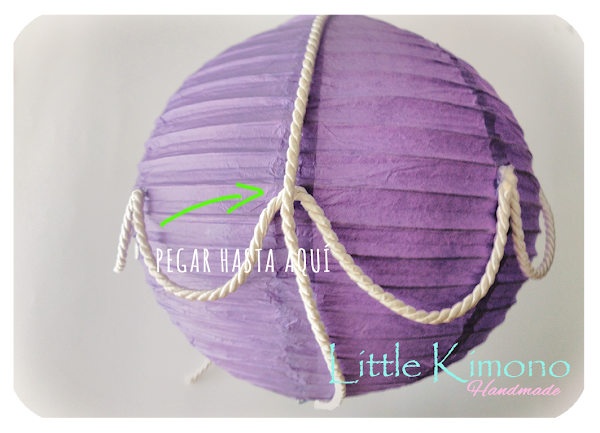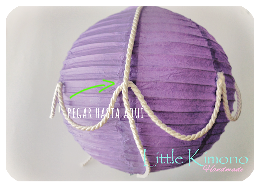 2. Segundo paso: La lámpara trae ocho marcas verticales en el papel, sobre cada una de ellas (hacia la mitad de la lámpara) pegaremos con la pistola termofusible unos trozos de cordón a modo de "guirnalda" como muestra la foto.