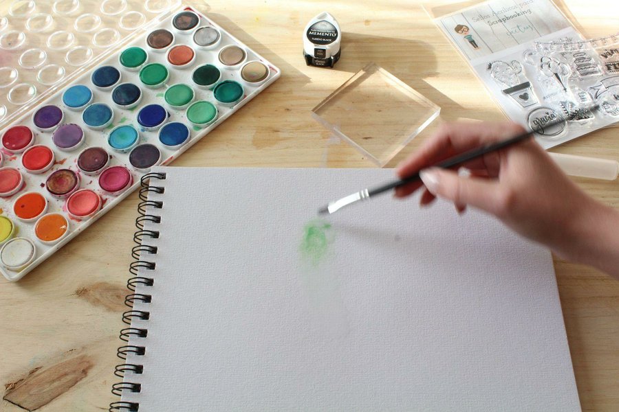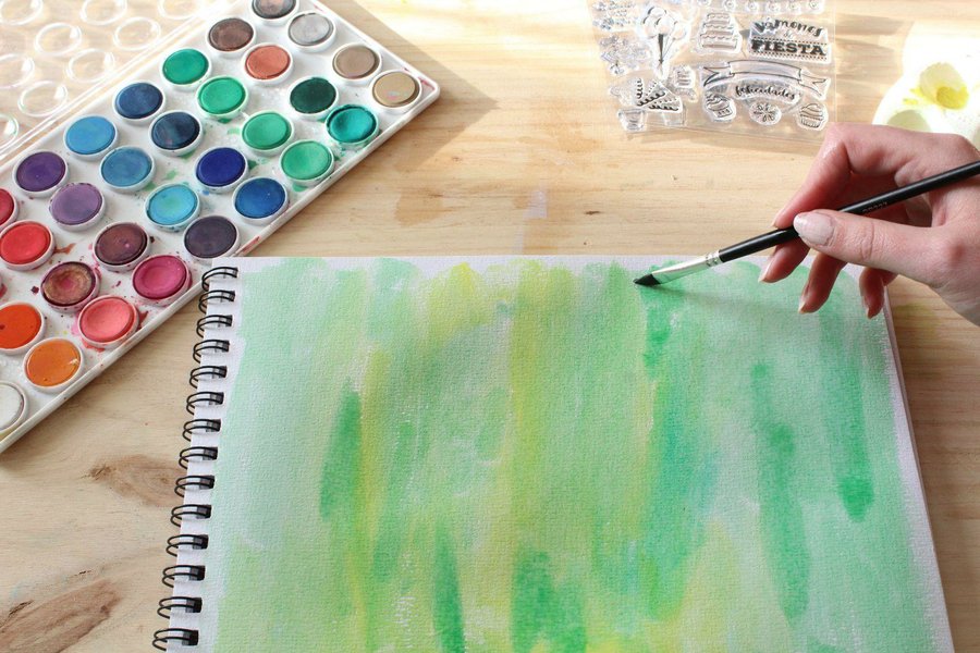1 paso: para crear los detalles que decoran nuestras cajas, preparemos una hoja de acuarelas y la pintaremos en tonos verdes y amarillos.