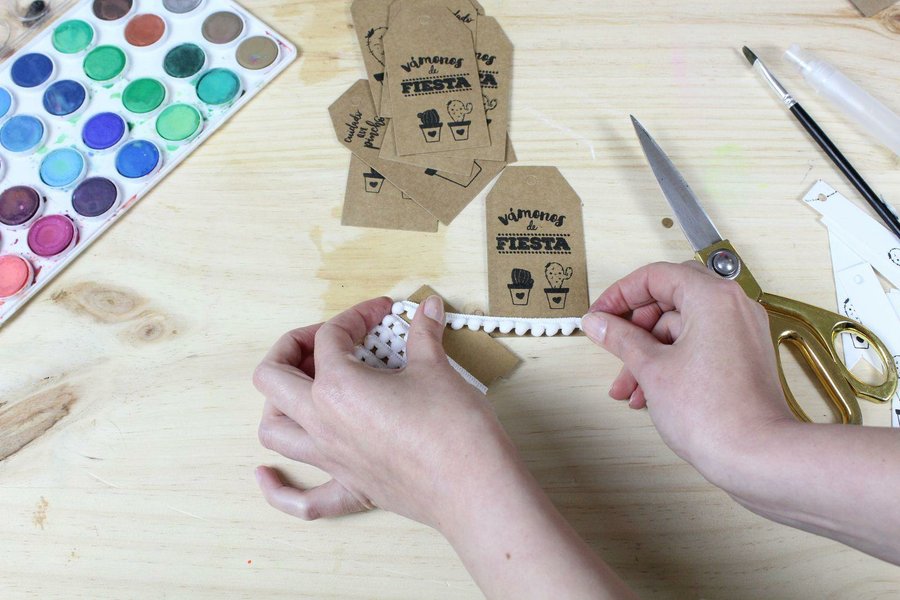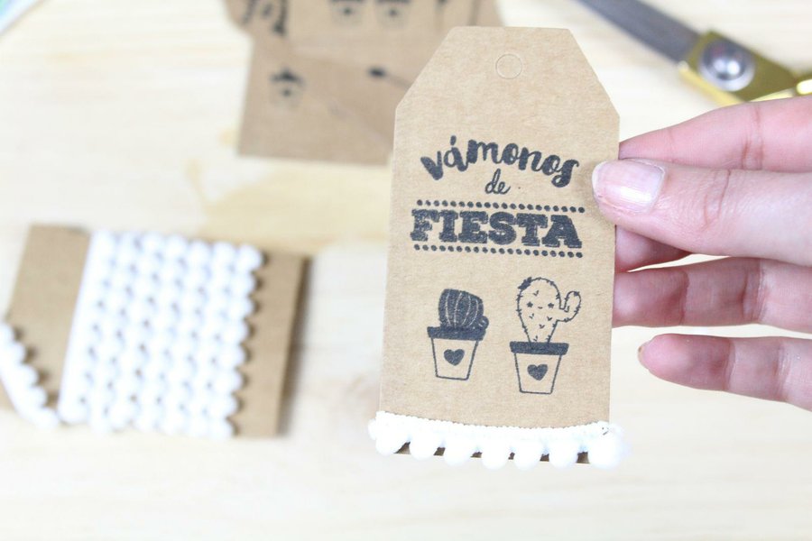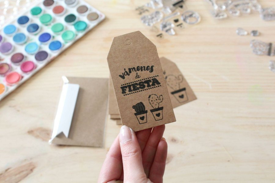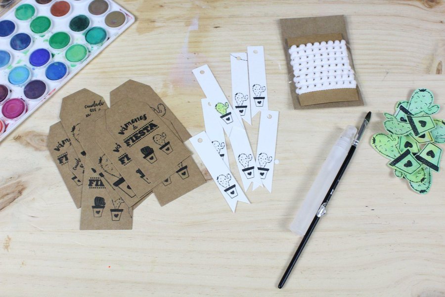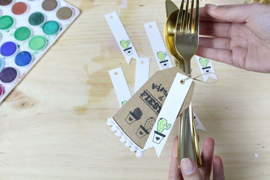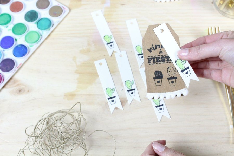 4 paso: decoraremos unas etiquetas para acabar de preparar nuestra decoración. Usaremos sellos de cactus y temática fiesta, cinta decorativa y acuarelas.