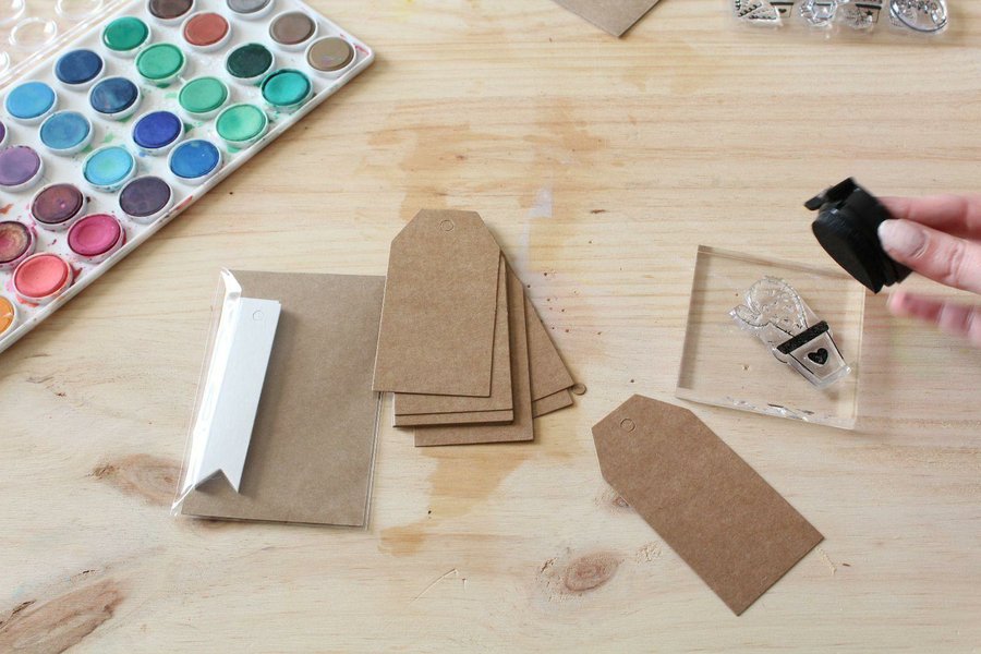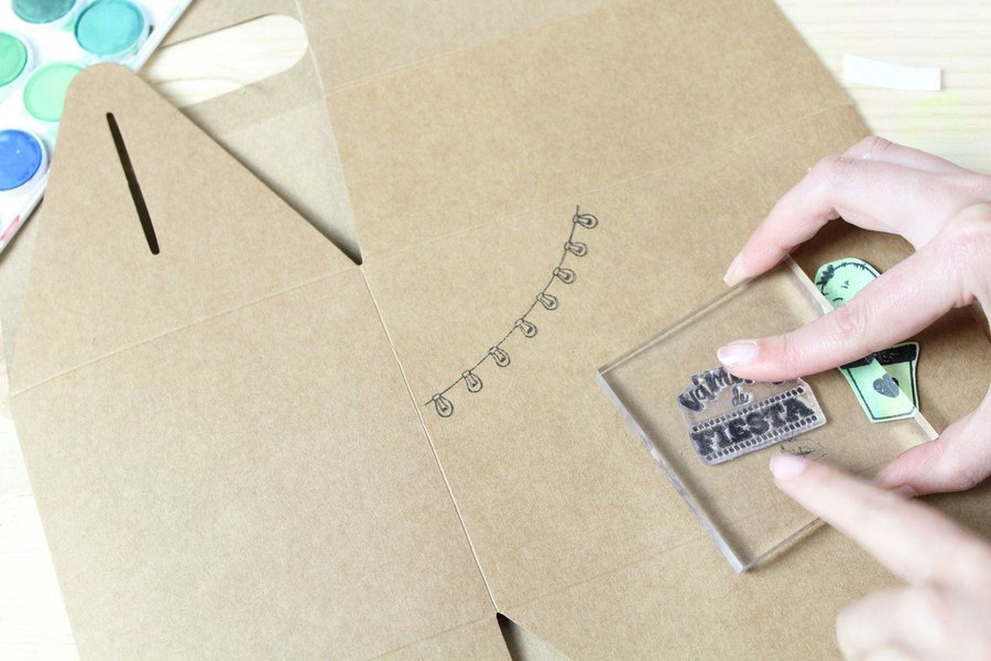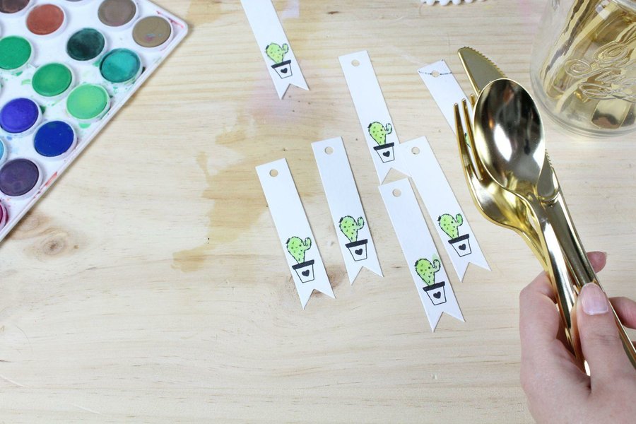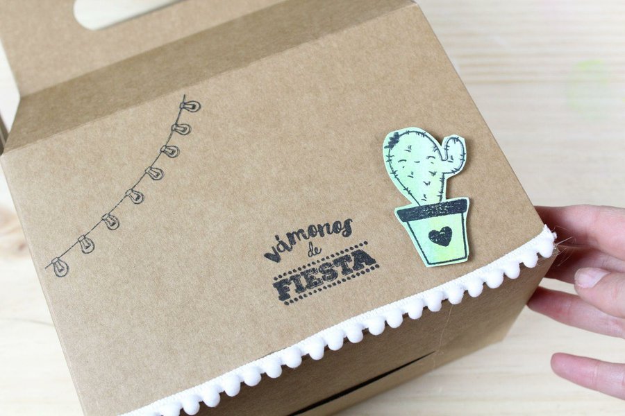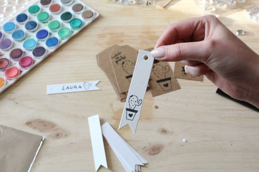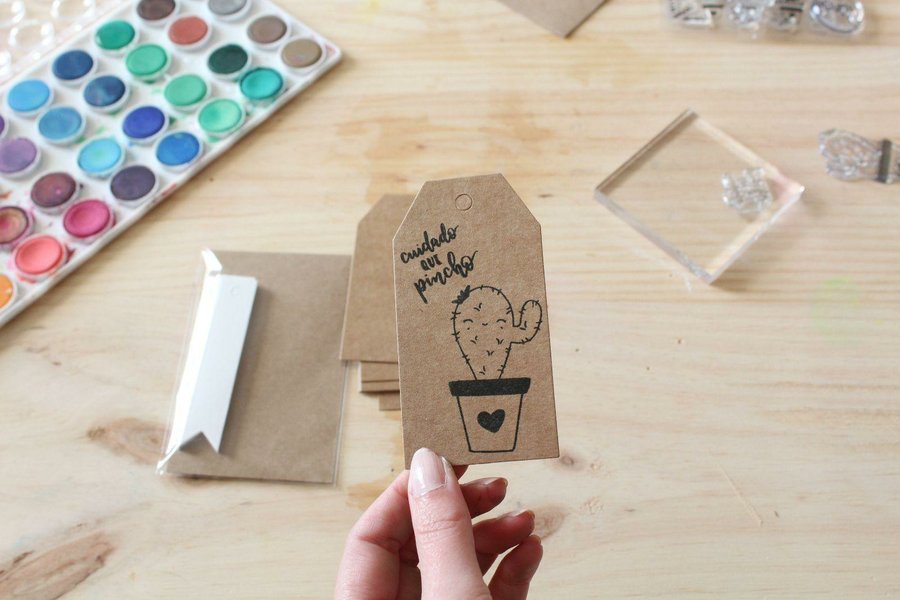 4 paso: decoraremos unas etiquetas para acabar de preparar nuestra decoración. Usaremos sellos de cactus y temática fiesta, cinta decorativa y acuarelas.