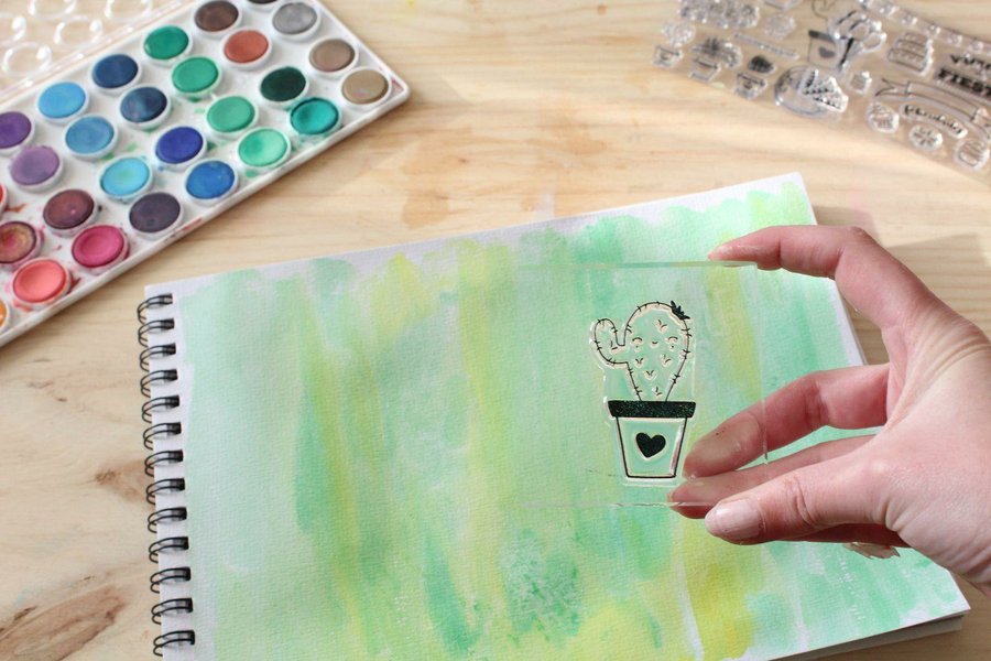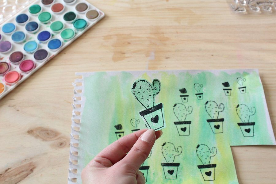 2 paso: una vez tenemos nuestra hoja pintada, con el sello que más nos guste de cactus hacemos varias estampaciones, recordar usar una tinta permanente.