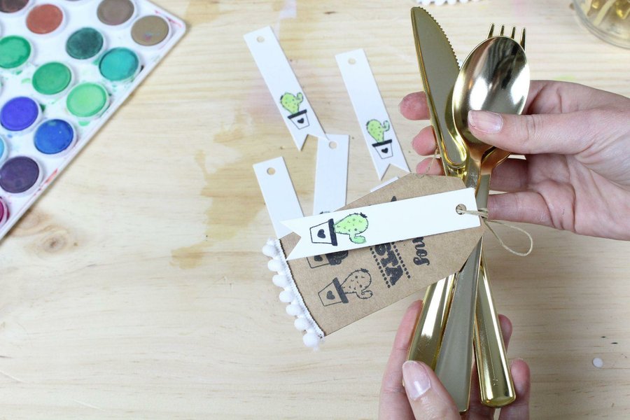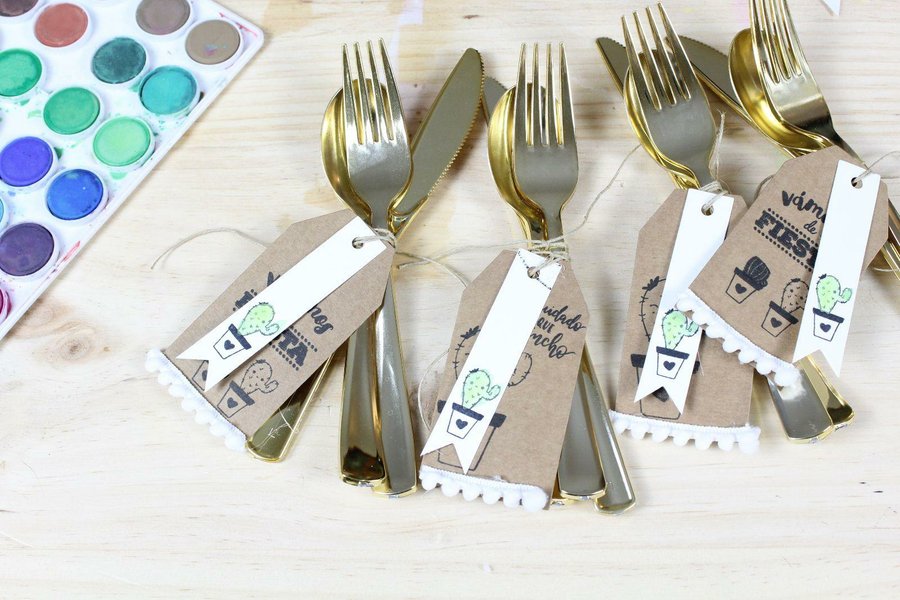 5 paso: usaremos las etiquetas decoradas para anudar los cubiertos y etiquetar a los invitados.