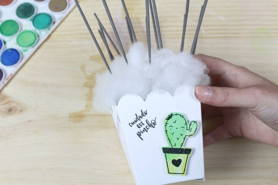 3 paso: vamos a decorar nuestras cajas con los cactus que hemos recortado, empezaremos por la caja de palomitas, que la transformaremos en un soporte para bengalas.