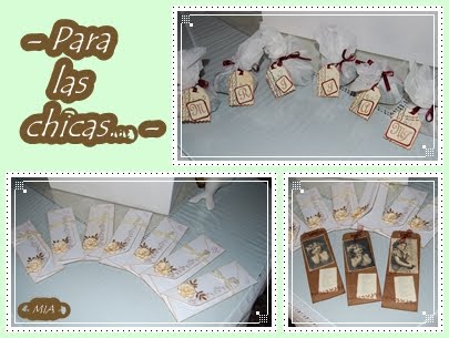Para las chicas... Un paquetito de jabones con aroma de vainilla y un marcapáginas clásico con cierto aire vintage. Sé que salieron "ganando", pero es para ellas me fue más fácil trabajar...