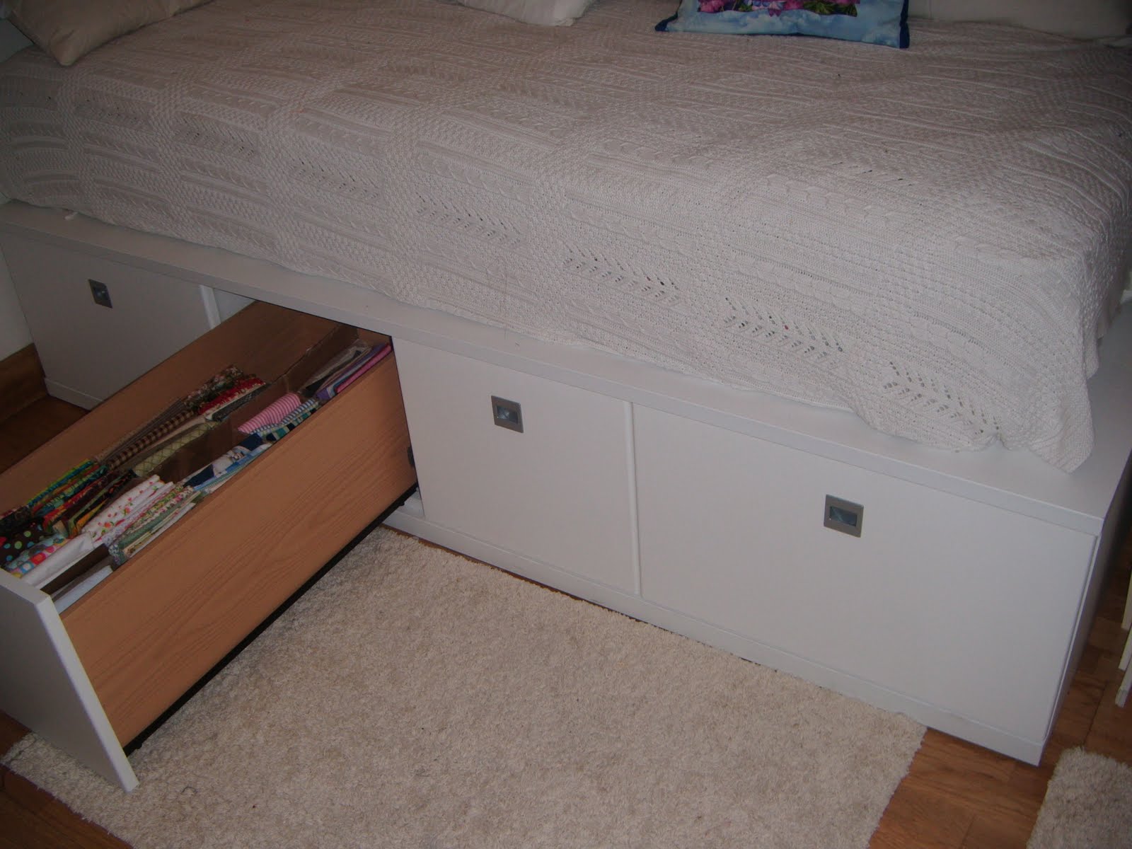 Mi cama en lugar de llevar otra debajo, tiene cajones de almacenaje, uno para telas por metros, guatas y entretelas y como no la bolsa por restitos. El siguiente es el de las telitas que he organizado, otro para lanas, hilos de punto de cruz, bastidores, agujas de punto, pelos para las muñecas y demas cosas que abultan, y por fin el ultimo para bolsosssssss, y entran todos, pero como siga haciendo no se donde los metere y eso que regalo casi todos.