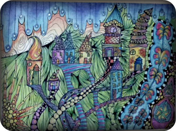 De momento os dejo con el último reto del grupo de zentangle , se trataba de un paisaje real o inventado , y esta ha sido mi propuesta , un pueblecillo de cuento...