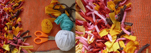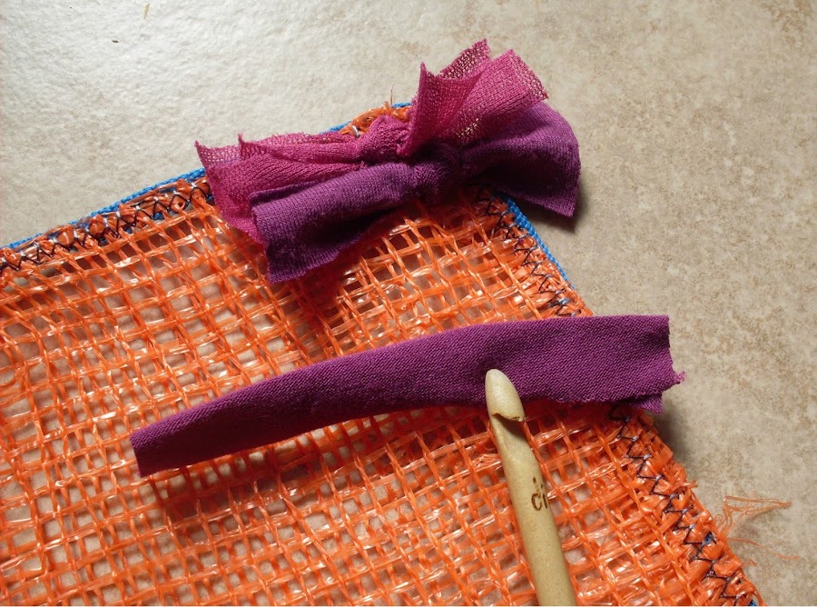 Con una aguja a crochet enhebrá los trocitos de trapillo en los agujeritos y anudalos.