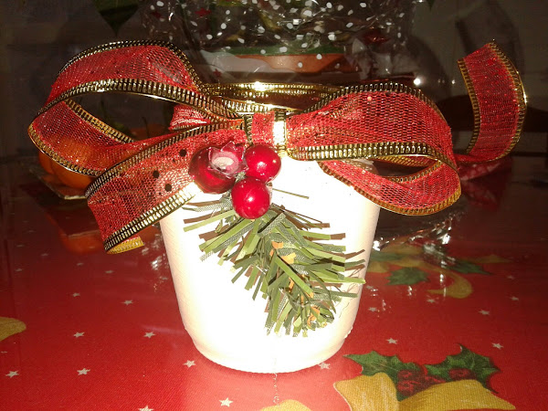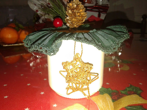 Dos tarritos, este es el primero, realizado con material reciclado este es un botecito de cristal que contenia paté, y le he puesto tres manos de pintura para cubrirlo bien con un blanco vintage, una puntilla que me había sobrado de otro trabajo que os mostraré la semana que viene, si Dios quiere, unas estrellitas que tenia guardadas de un regalo que me hicieron y las llevaba, y la piña el muerdago de una corona de navidad vieja, viejisima que deseché y he aprovechado todo de ella en otras cosas que tambien vereis.