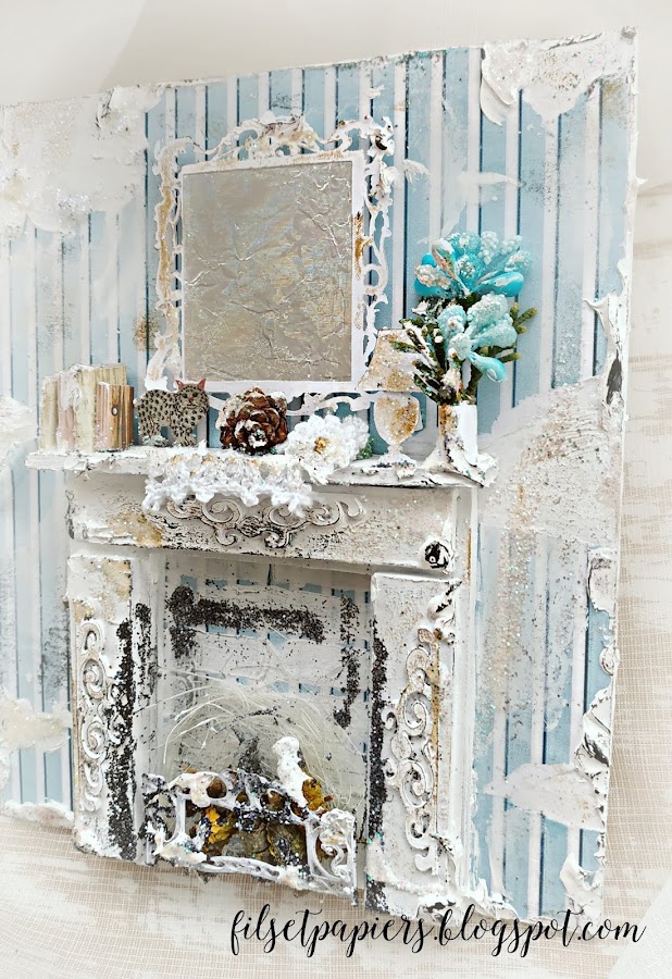 I used a piece of wood for the base, white acrilyc paint, glitter, embellisments, scrapbook paper, some svg image than I cut with my cameo to do the mirror, lamp, fireplace embellishments and the guard.