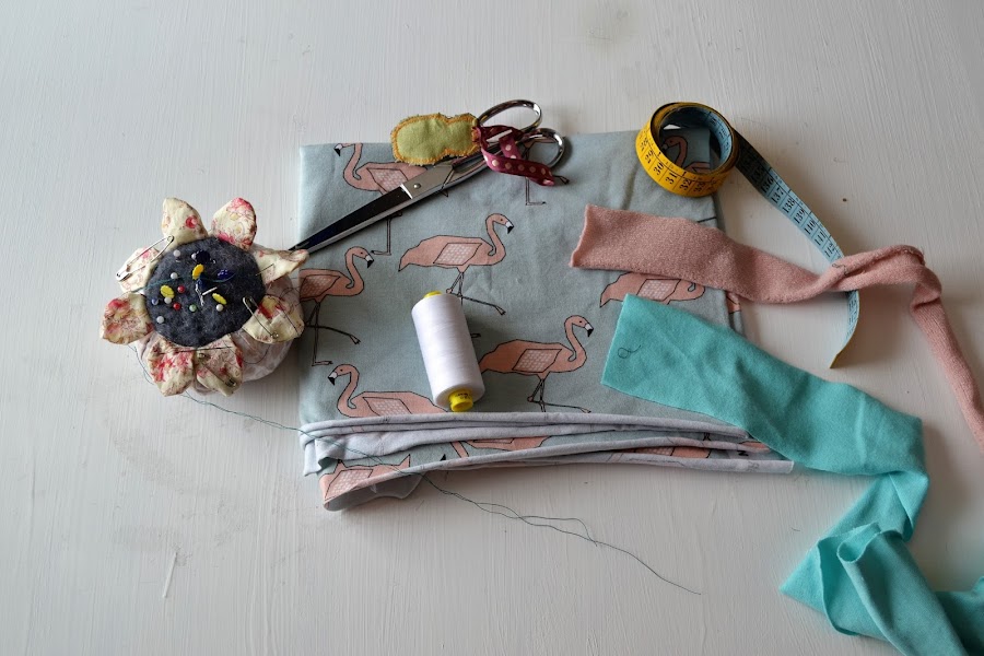 - Tela de flamencos 45 cm, si queréis utilizar 70 cm de largo os ahorrareis el tener que hacer la costura que he realizado yo para alargar la tela.