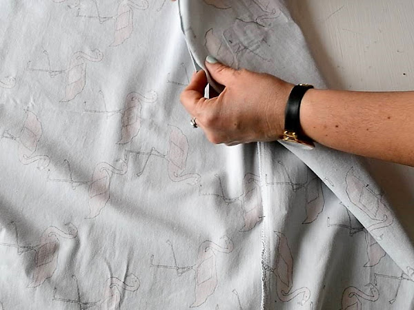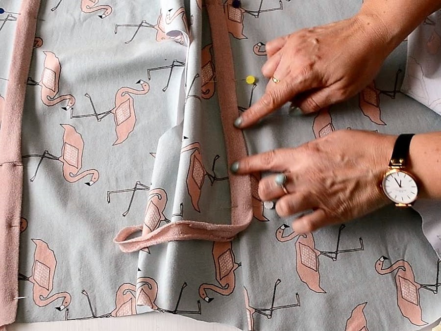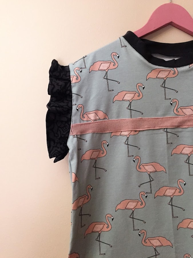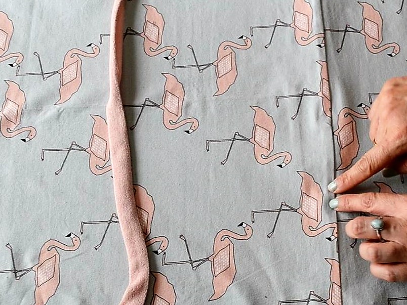Para decorar la camiseta y de paso tapar la costura de unión que hice para alargar la tela, utilice una tela de punto en el mismo tono de los flamencos, que planche con los bordes hacia adentro para coser más fácilmente.