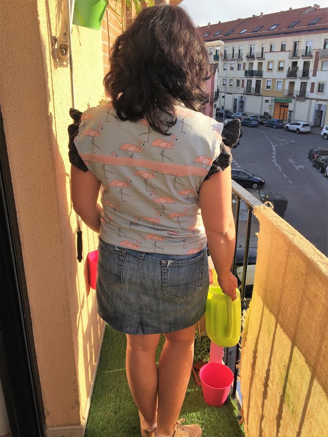 Tenemos que tener en cuenta que esta tela al tener los flamencos nos obliga a cortar en la misma dirección, no podemos poner los flamencos tumbados. Ademas a la hora de unir mis dos trozos de tela tengo que tener en cuenta que los flamencos deben casar, no puedo poner una cabeza de un flamenco encima de la de otro, debe ir en armonía el dibujo. Esta es la parte más complicada de la camiseta. Pero si tenemos 70 cm de largo de la tela evitamos este paso y todo será mas sencillo.