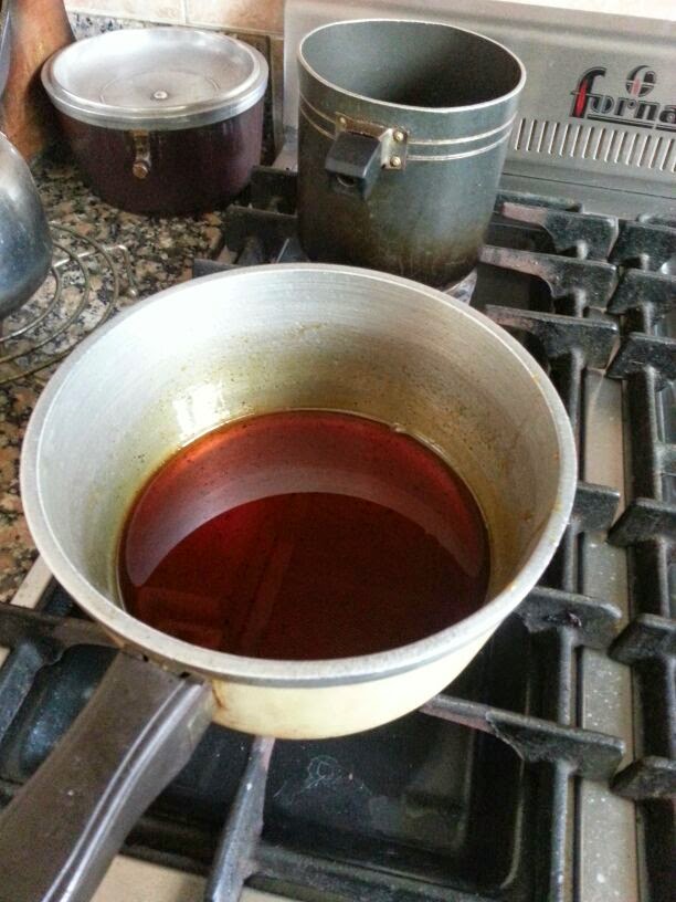 Caramelo líquido ya enfriándose, la ollita del fondo es donde tenía el agua hirviendo para ir agregando las cucharadas