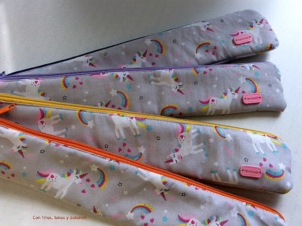 Hice 6 estuches de unicornios, cada uno con su cremallera en diferente color. Iba a ponerles mabién el botón handmade a juego con las cremalleras, peeeeeeero ahí nos encontramos con que no había botones en todos los colores. Así que los botones van todos iguales en rosita.