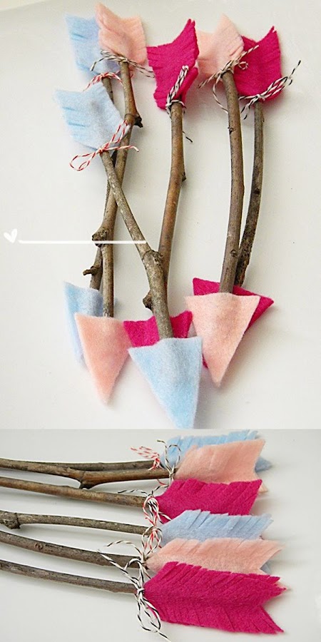 Utiliza ramas ,fieltro y listones para hacer estas divertidas flechas , seguro quedan lindas en cualquier decoración de San Valentín o proyecto escolar .