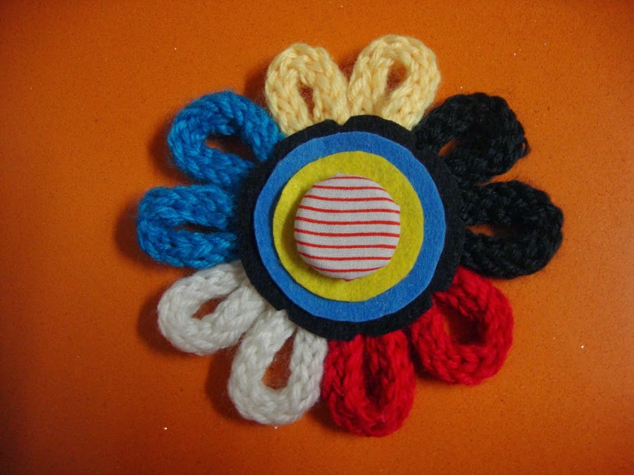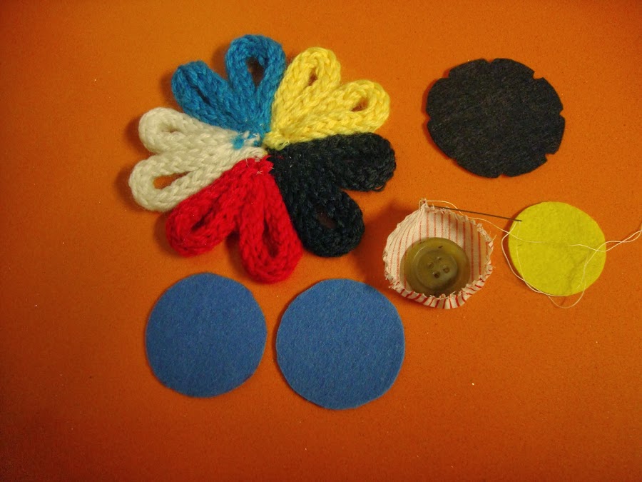 Para el centro elegí varios adornos en tela y fieltro de los mismos colores que los pétalos. Tres círculos de fieltro de mayor a menor tamaño en negro (a éste le hice unas muescas), azul y amarillo y en el medio un botón cubierto con un círculo de tela de rayas blanco-rojo (se frunce por el borde con unas puntadas, se cierra, se asegura y ya está) .