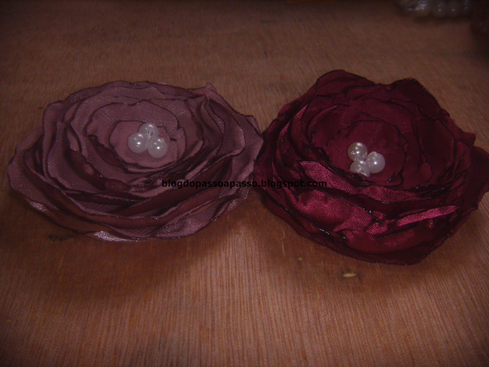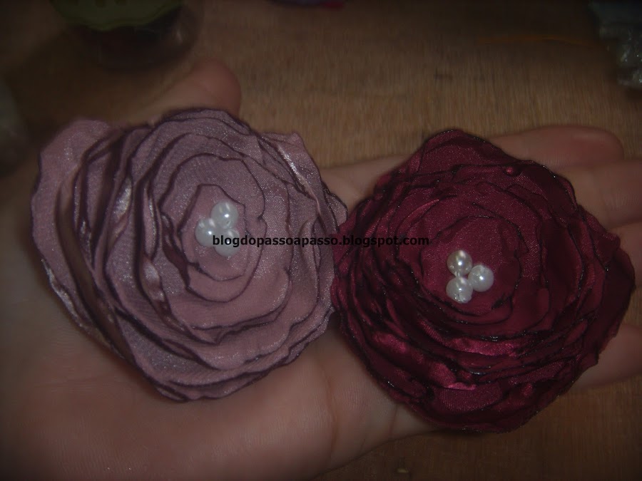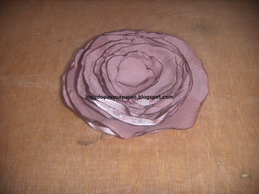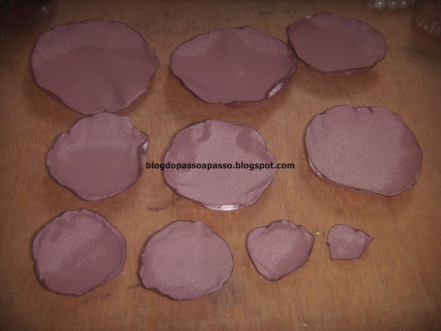 Corte vários circulos de cetim. a quantidade é você quem determina. Aqui eu usei 2 círculos de 7cm, 2 circulos de 6 cm, 2 circulos de 5cm, 2 circulos de 4cm e 2 circulos de 3cm.