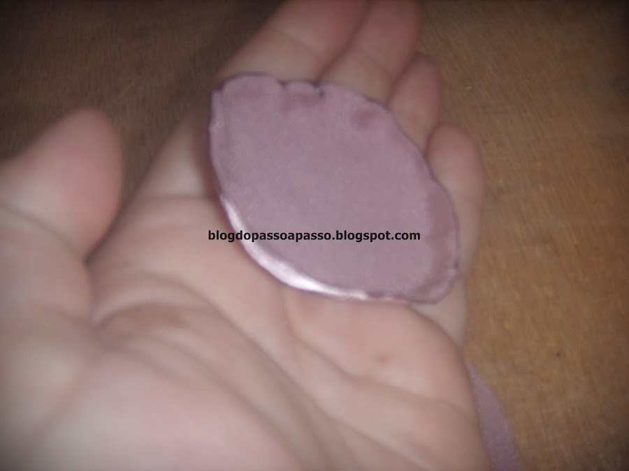 Passe cada círculo próximo a chama da vela, para dar o formato de concha. Eu pasei o lado fosco do cetim, aí quando a pétala emborca, as bordas ficam brilhando.
