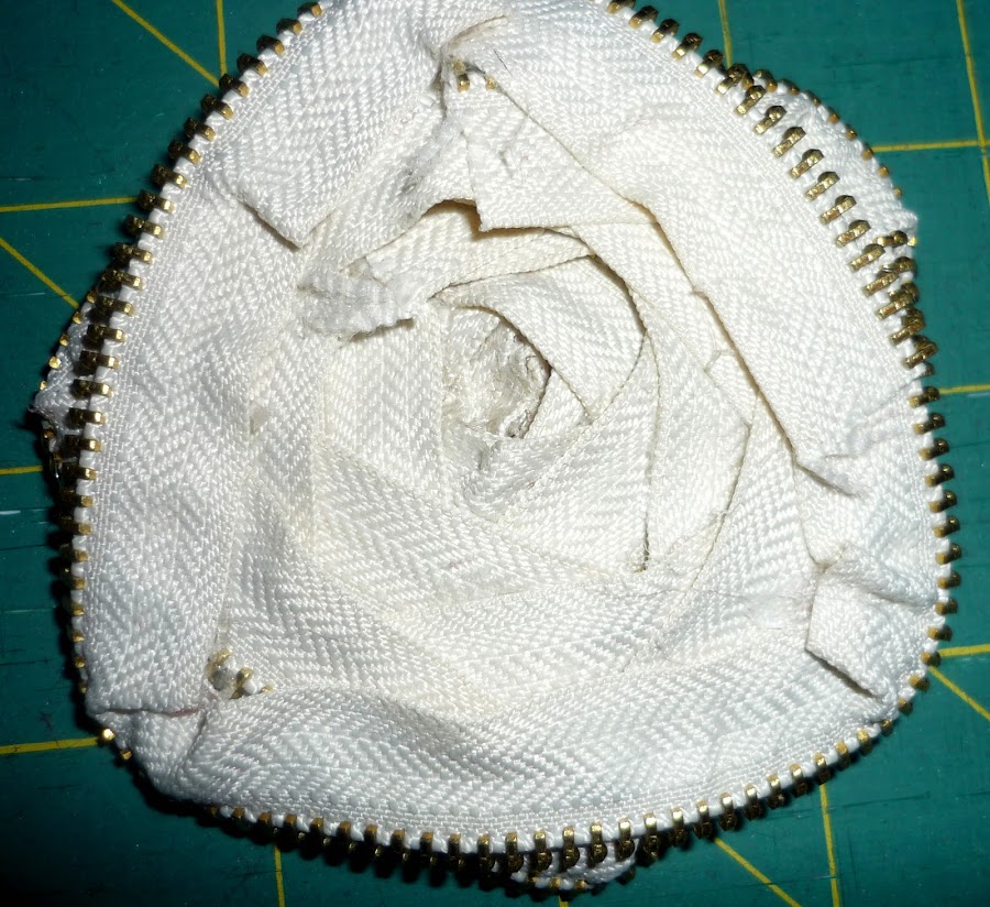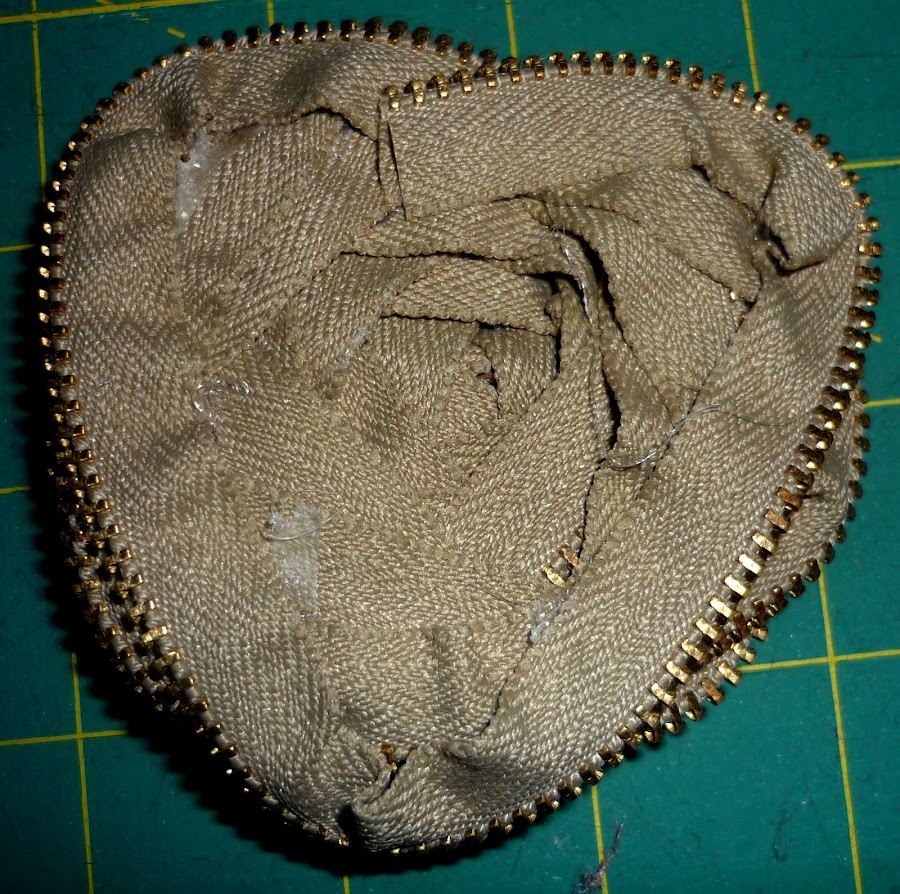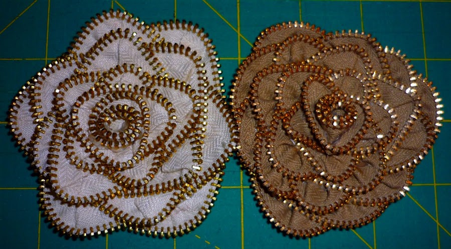 He utilizado dos cierres diferentes. La cremallera más oscuro es sólo 1/2 pulgada de ancho, y la cremallera más ligero es 5/8 pulgada de ancho. La pulgada extra de 1/8 hizo mucho más fácil para formar los pétalos, sin la tela se afloje o tener lagunas.