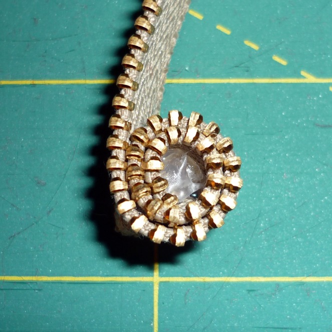 Crear pétalos doblando la cremallera en un punto y pétalo encolado en su lugar. Forma pétalos de forma continua en un patrón triangular alrededor del centro.