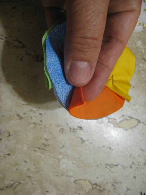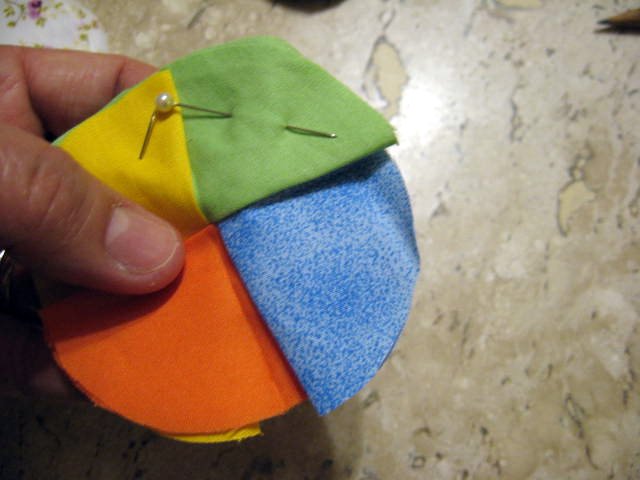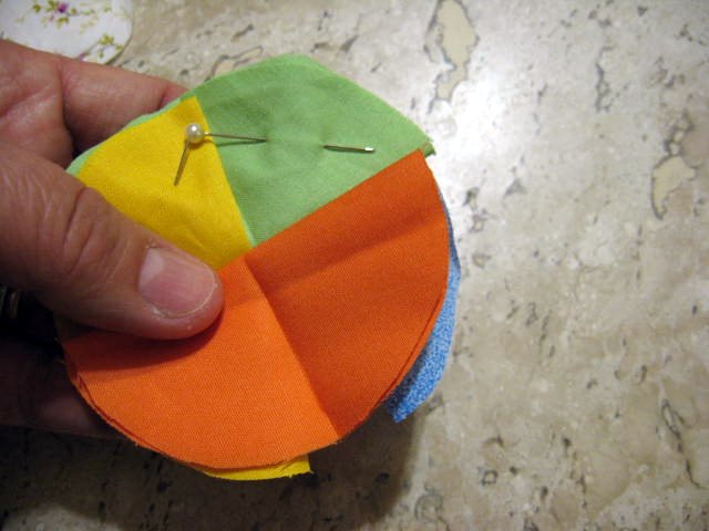 Corte 4 círculos de tecidos diferentes. Podem ser só 2 cores diferentes. Do seu jeito.