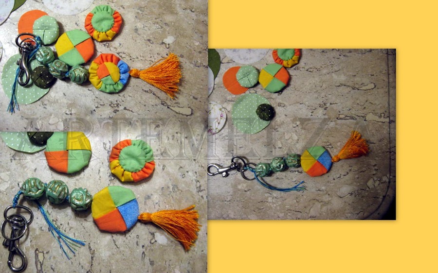 Além de chaveiros você pode criar diversas coisas com esse fuxico. Ele é feito com 3 ou 4 fuxicos de 9 cm de diâmetro. Pode ser feito maior ou menor.