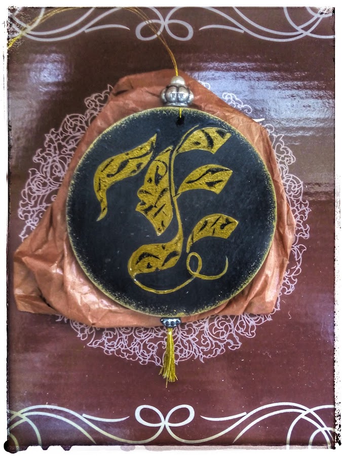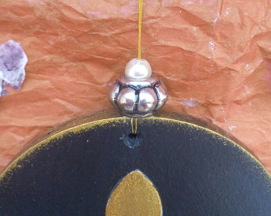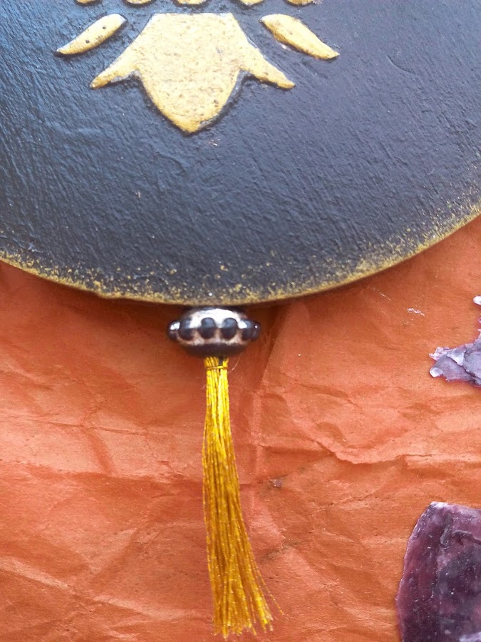 Unos hilos dorados a modo de flecos en la parte inferior y en la superior para que podamos colgar el medallon y unos adornos pegados en los bordes,son los últimos pasos para finalizar este trabajo.