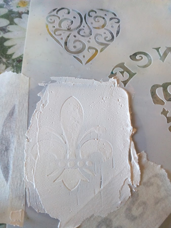 Una vez sujeta la plantilla, con una paletina, aplicamos la pasta de relieve, estuco, modeling paste o incluso la pasta aguaplas que se compra en ferreterias . En esta entrada que os recuerto AQUÍ el stencil en relieve está realizado con esa pasta.