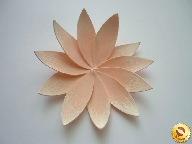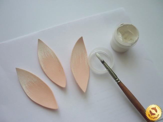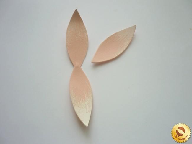 Calentamos cada pétalo con la plancha para que tenga su forma más parecida al loto natural. Luego con la pintura acrílica escolar pintamos un poco las esquinas de cada pétalo.