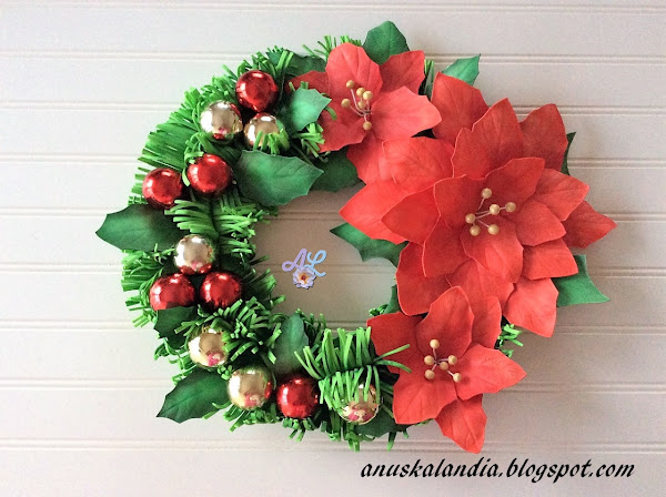 16.- Vamos ya con la decoración de la corona. Tomamos las 3 hojas grandes y las pegamos donde más nos guste. Pegaremos encima la poinsettia grande.
