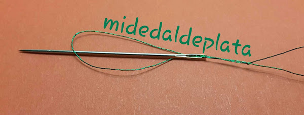 La gama Lamé de Anchor es un tipo de hilo con el que no se puede realizar un bordado fácil. Si observamos el hilo en sí podemos comprobar que está formado por pequeños fragmentos alargados y curvos de material metálico brillante. Estos fragmentos están huecos por lo que permiten pasar un hilo por su interior, y es este hilo el que mantiene a los fragmentos engarzados unos con otros. Debido a esta estructura, si enhebramos la aguja de la forma convencional, al tirar del hilo con el gesto de bordar, el ojo de la aguja encontrará el hueco entre dos fragmentos para quedarse siempre situado ahí, aumentando cada vez más la separación entre los mismos. Con las pasadas por la tela, la tensión hará que la distancia entre los dos fragmentos vaya aumentando, exponiendo el hilo que los une a una mayor fricción con la aguja. Al poco de iniciar el trabajo se podrá observar un auténtico deterioro en el hilo con el que se está bordando, acortando su longitud útil. En algunos casos, antes de apreciar el mal estado del hilo, ya se habrá producido la rotura del mismo, hecho que impedirá terminar de bordar el dibujo o realizar un remate elegante. Por tanto, al trabajar con este tipo de hilo es fundamental enhebrar la aguja con una lazada, como se muestra en las próximas imágenes. La torsión entre fragmentos no es tan prominente y brusca como en el enhebrado habitual, evitando deformar la estructura del hilo.