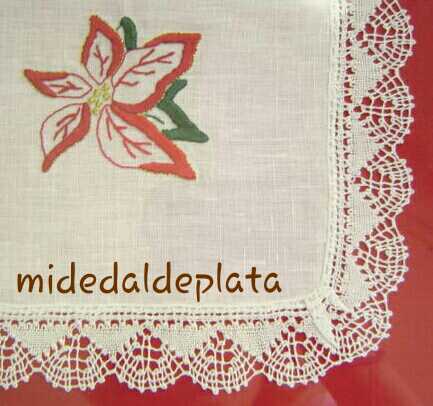 Una de mis primeras puntillas de bolillos sirvió para enmarcar una flor de Pascua bordada, y que mi Madre transformó en una admirable bandeja. Se trataba de una tira recta a la que se le obligó a formar esquinas, con el borde hecho en pluma. Quizá se trate de la segunda puntilla de bolillos que hice y a la que se le podría reconocer como tal sin provocar risa. A pesar de sus fallos técnicos, produjo bastante satisfacción en esta aprendiz de encajera.