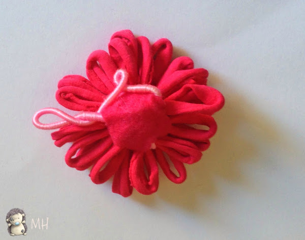 Como lo que yo quería era una flor más grande y consistente (para poder usarla como coletero) he hecho esta Flor de Trapillo con Telar.