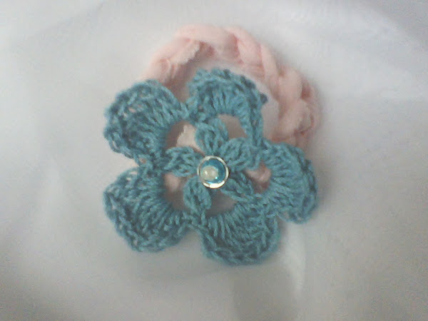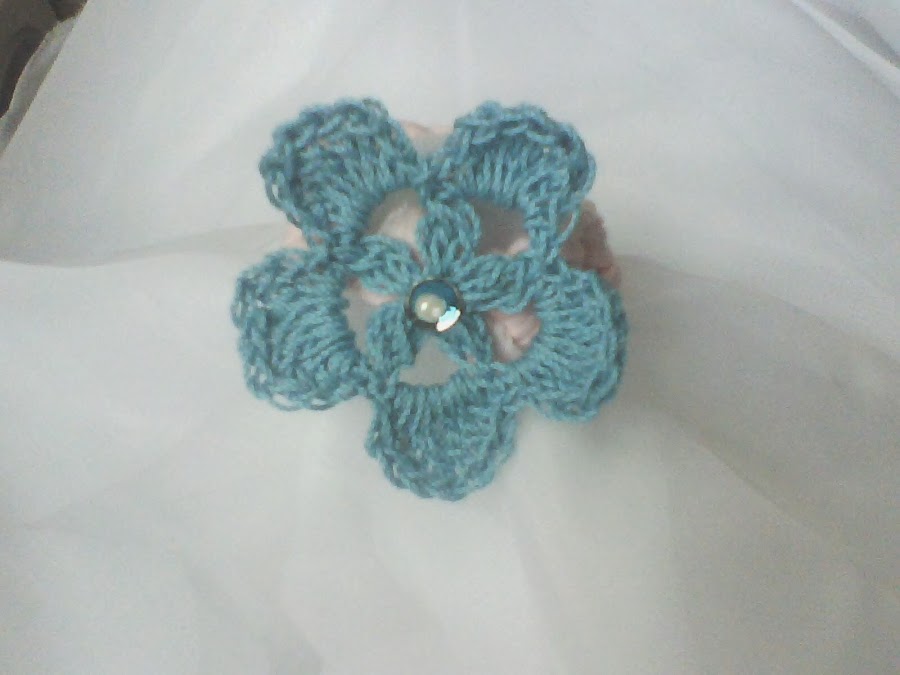 Use aguja crochet número 00 e hilo macramé color turquesa, en el centro como ven le puse dos lentejuelas y una mostacilla.