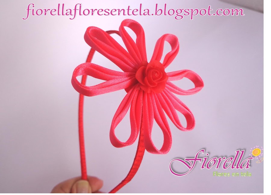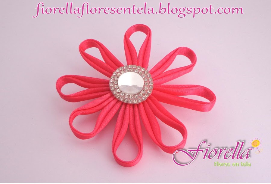 Yo la he llamado Flor estrella, por la forma de sus pétalos, la he hecho en cinta o listón de raso, en color coral, que particularmente me parece que la hace lucir mas.