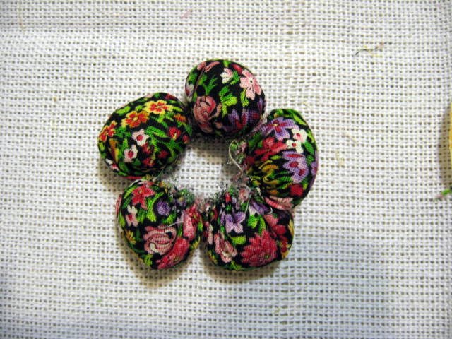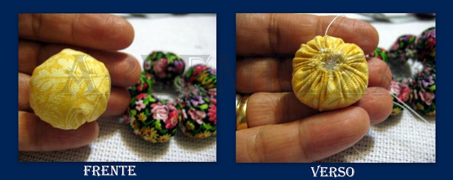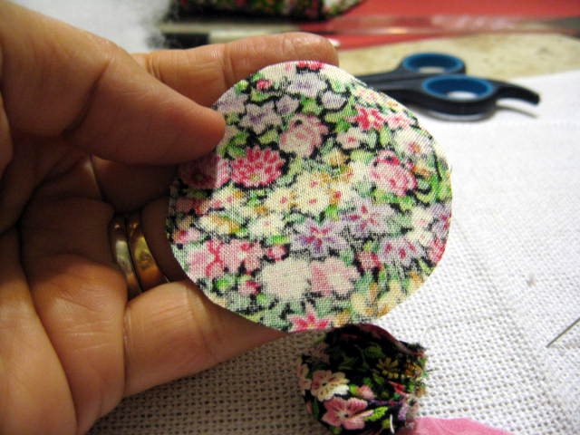 a) corte 5 círculos de 6cm de diâmetro com um tecido florido.