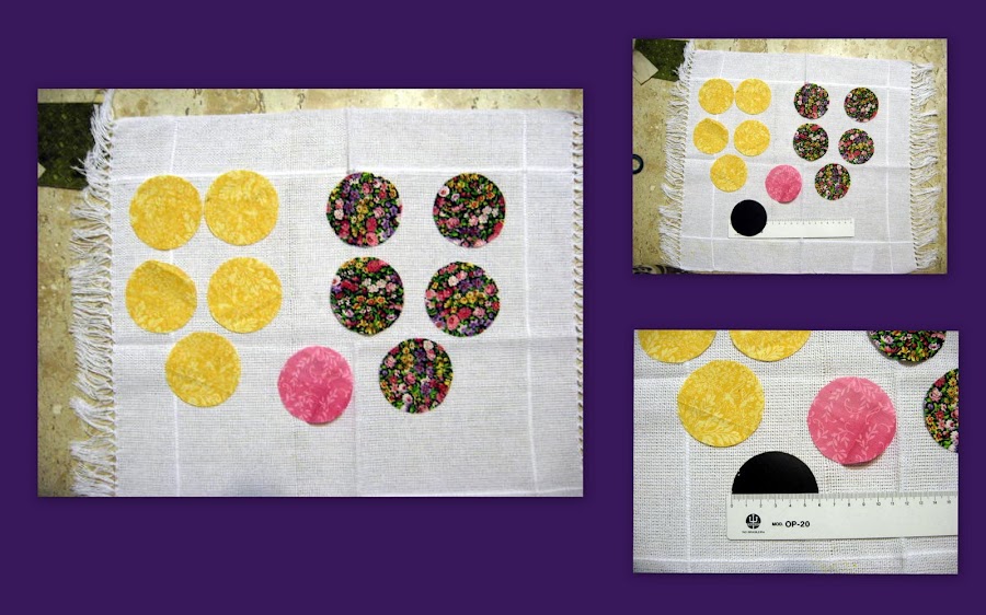 Corte 7 vezes, num terceiro tecido, círculos de 9cm de diâmetro. Reserve um.