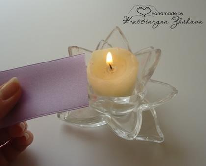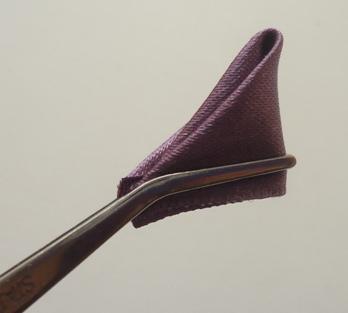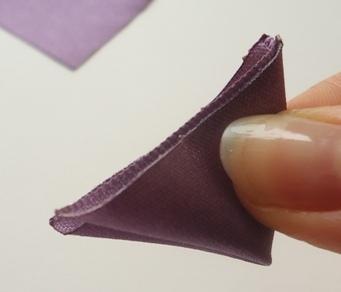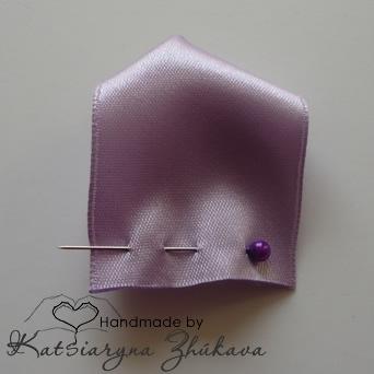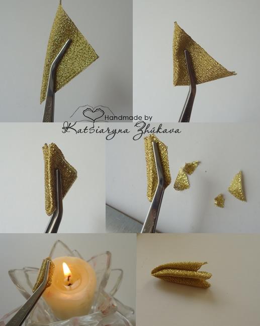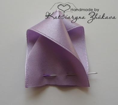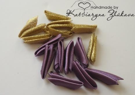 La base para la flor está lista. Ahora procedemos con la elaboración de los pétalos triangulares. Necesitamos cuadrados de la cinta de 4 cm: morado y dorado.