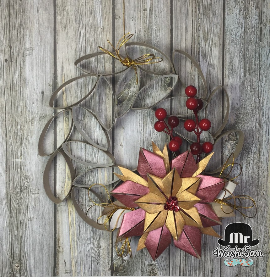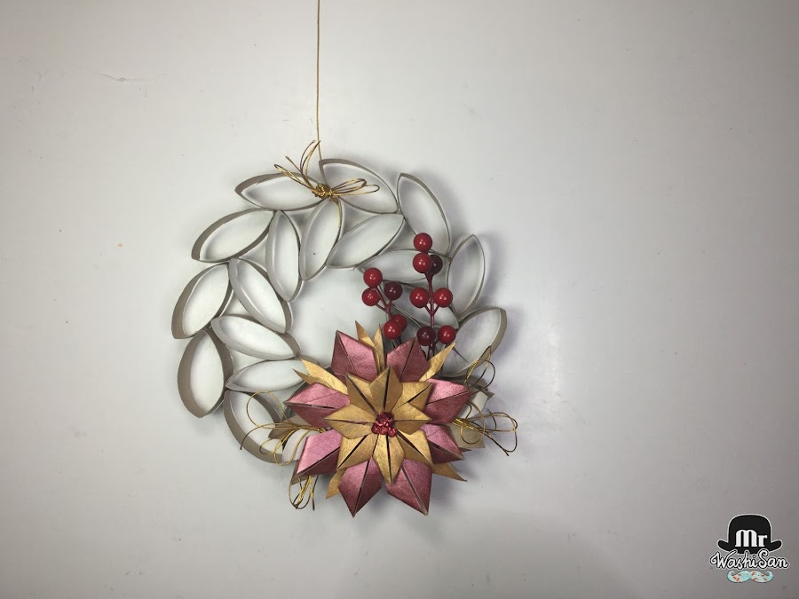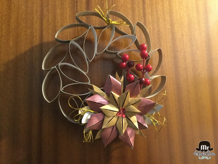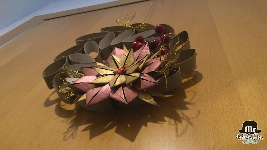 Pero yo he decidido continuar decorándolo poniendo unas cuantas lentejuelas en el centro de la flor, unas hojas de cartón de los mismos tubos de papel higiénico alrededor de la flor, dos ramas artificiales de frutos rojos y unos lazos muy finos de cordel dorado en ambos lados.
