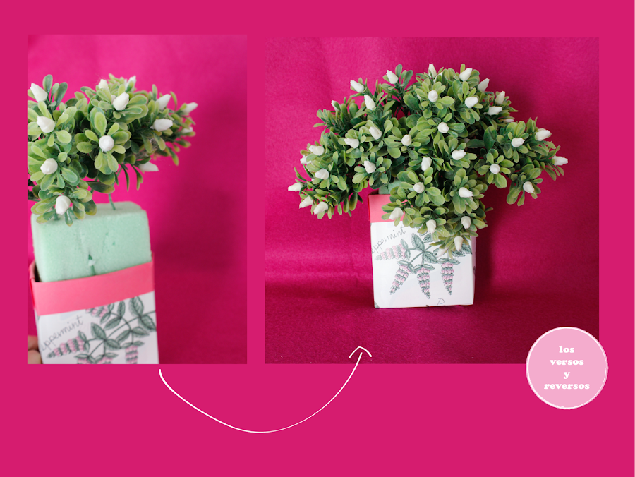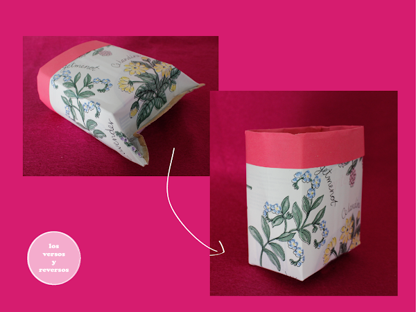 Primero, lavé el envase y lo corté a tres cuartos de su tamaño. Después recorté el papel contact con motivos florales al tamaño y lo pegué al envase. Vi que hacía falta un detalle, así que recorté una tira de papel rosa de cuatro centímetros de ancho y lo pegué en la orilla.