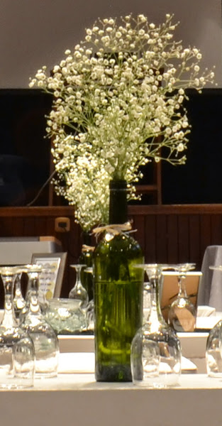 En cada una pusimos un ramo de Gypsophila, flores blancas, chiquitas pero muy delicadas y vistosas. (Las margaritas son otra buena alternativa).