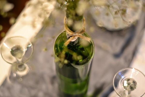 Por un tiempo estuve coleccionando diferentes botellas de vino esperando encontrarles un buen uso algún día. Y ese momento en que pasaron de ser basura acumulada para hacerse útiles llegó cuando empezamos a organizar una fiesta de 25 aniversario y pensar en su ambientación.