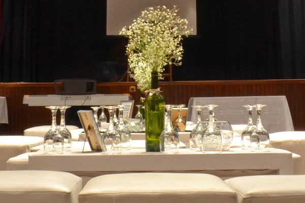 Así, con un florero, acompañado de un cuadrito con una frase en los colores temáticos, vestimos cada una de las mesas. Resultó una idea práctica, rápida y económica (ya que las botellas son recicladas y estas flores que son usualmente "de relleno" para ramos de otras flores no son muy caras en la época de primavera-verano).