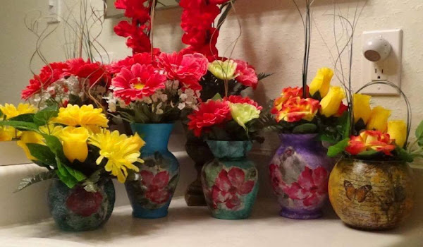 DÁNDOLE UNA NUEVA APARIENCIA MODERNA , VINTAGE , ELEGANTE CON SOLO PINTURAS ACRÍLICAS Y USANDO SERVILLETAS CON LINDOS ESTAMPADOS PODREMOS TRANSFORMAR NUESTROS FLOREROS O BASES DE CRISTAL