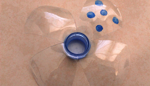 Vamos a utilizar sólo la parte superior de la botella, la boca, el tamaño el que mas os guste, cuanto mayor sea la botella, mas grande será la flor. Cortamos la botella, dependiendo de donde hagáis el corte, serán mas largos los pétalos, a vuestro gusto.. Para éste primer corte yo utilicé un cuchillo de sierra, para el resto unas tijeras pequeñas, como las de manicura para trabajar mejor..