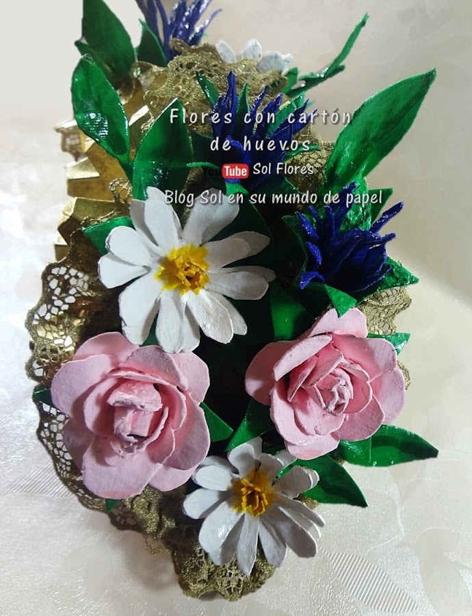 Un hermoso arreglo floral hecho completamente con cartón de huevos.