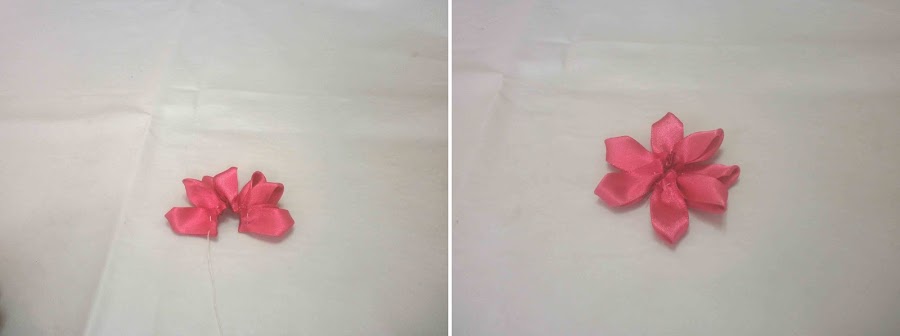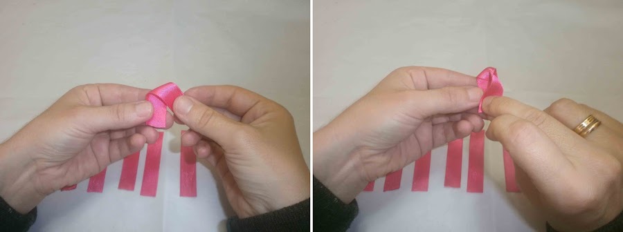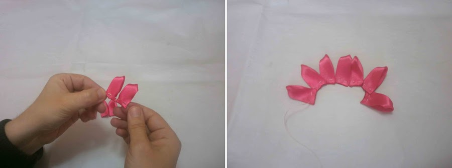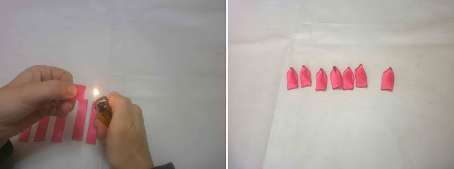 Para hacer los pétalos se dobla la cinta hacia atrás y a la derecha para luego girarla a la izquierda. Se sella con un mechero.