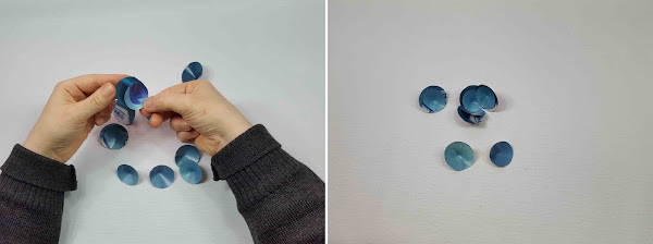 Dejamos reservado un circulo grande y otro pequeño sin pegar. Para formar la flor, pegamos y unimos los pétalos.