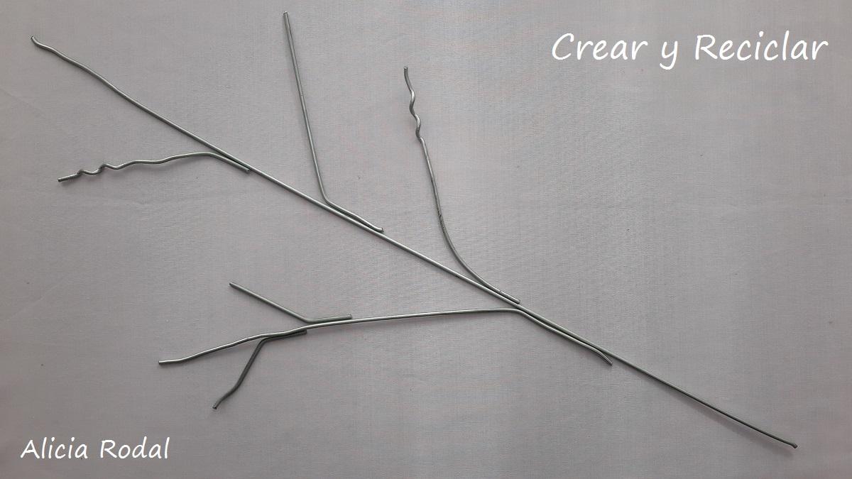 Para hacer el tallo de la flor, también conocido como vástago, renuevo, etc, voy a reutilizar una percha metálica, la que usamos para la ropa. Si no tienes este tipo de perchas, puedes usar alambre, barra, varilla o perno, que no sea demasiado delgado, porque no aguantaría el peso de las flores, ni tampoco demasiado grueso, ya que sería muy difícil de cortar y doblar.Cortamos el alambre de la percha, según el tamaño o largo que queramos el tallo de nuestras flores. También cortaremos otras piezas más pequeñas para darle forma de tronco, troncho, leño o madero, según el diseño de nuestro ramo. Pegamos estas piezas con la silicona caliente u otro pegamento de contacto.